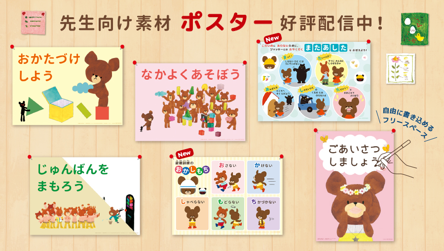 幼稚園・保育園ですぐに活用できる、 「くまのがっこう」のとっても可愛い 無料ダウンロードコンテンツがたくさん!