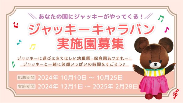 がんばる先生方、こども達を応援する「くまのがっこうしょくいんしつ」では、ジャッキーキャラバンの実施園を募集しています!