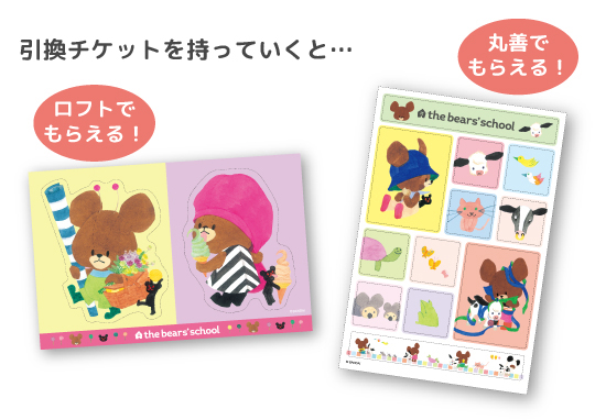 期間中、丸善仙台アエル店・仙台ロフトで「くまのがっこう」絵本もしくはグッズを買うと引換チケットをお渡しします。引換チケットを持って相互のお店に行くと、「くまのがっこう」シールをプレゼント!