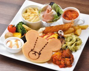 ハムとチーズのサンドイッチに、から揚げ・ソーセージ・スープ・ジャッキーパンケーキが付いたボリュームたっぷり盛りだくさんのメニューです。