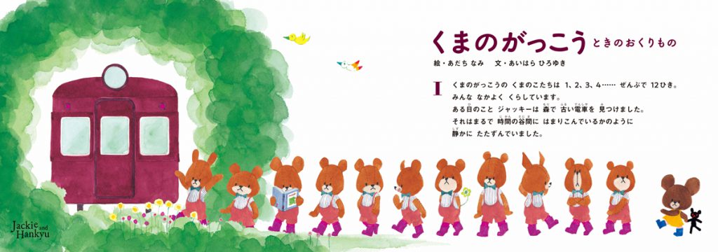 「えほんトレイン ジャッキー号」は、列車の中吊りで、コラボのために描き下ろされたオリジナルストーリー『ときのおくりもの』を掲示!電車に乗りながら「くまのがっこう」特別最新作のストーリーが楽しめます。