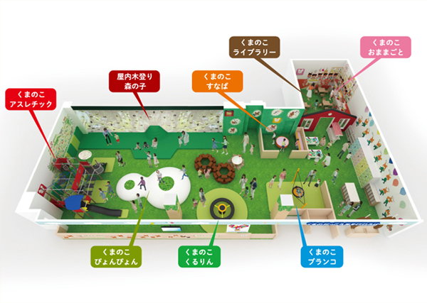 アスレチックや、水がなくても固まる砂場、おままごとコーナー、そして「くまのがっこう」シリーズの絵本が読めるライブラリーなど…