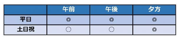 平日:一日を通して、ゆったりとご利用いただける日が多いです。
