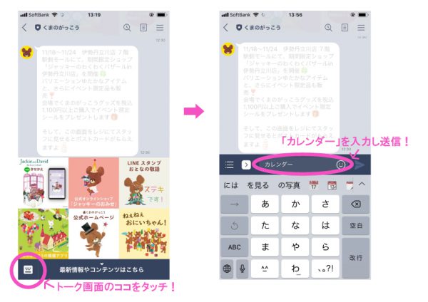 ②トーク画面に合言葉の「カレンダー」を入力、送信。