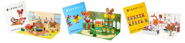 ジャッキーに着せ替えできるお洋服パーツもそれぞれ違いますし、舞台となる台紙の表紙もそれぞれカラフル!ついつい集めたくなる要素満載です。