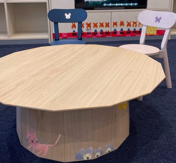 ジャッキーやフレンズ達があしらわれたテーブルや椅子も。くまのがっこうのぬりえを楽しむことも出来ます。