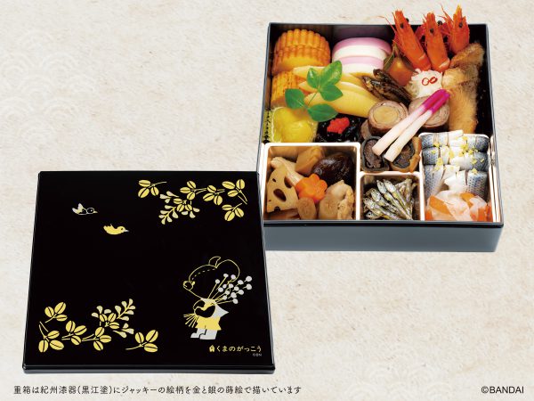 紀州漆器(黒江塗)にジャッキーの絵柄を金と銀の蒔絵で表現した本格的な重箱は、お正月の後も長く活躍してくれるはず!