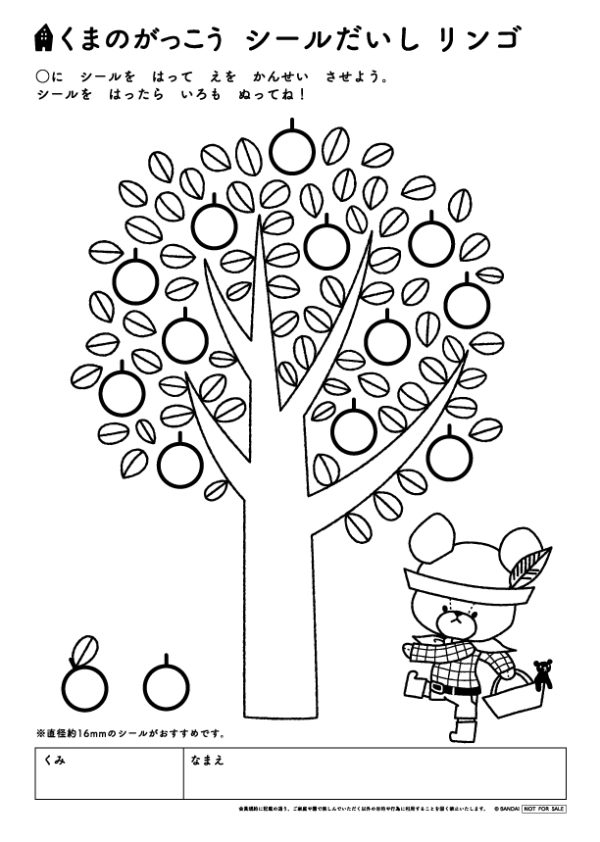 〇枠にシールを貼って、リンゴの木を完成させてね。(シールのサイズは16㎜がおすすめです)