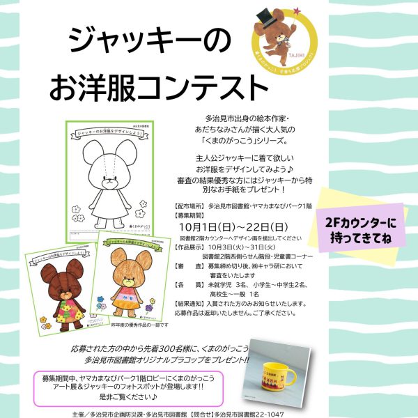作家あだちなみさんの出身地、岐阜県多治見市にある多治見市図書館にて「くまのがっこう ジャッキーのお洋服コンテスト」を開催します!
