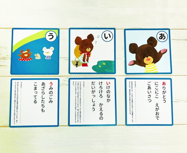 絵札には、あたたかく色彩豊かな「くまのがっこう」のワンシーンを使用。リズム感が心地よく、子供も読みやすい読み札には、大人の方への解説入り。