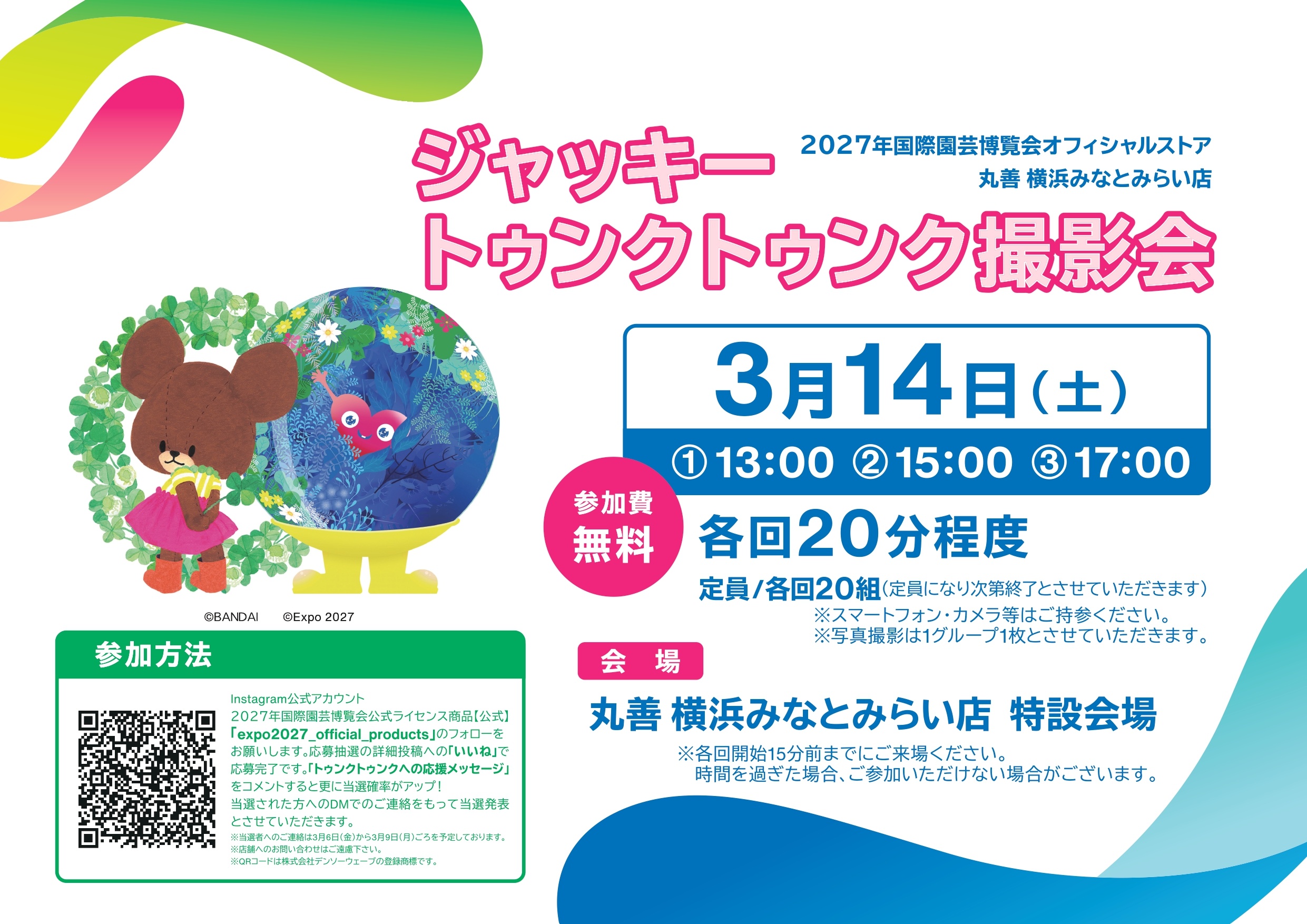 本コラボレーションを記念し、発売日当日の3月14日(土)には、EXPO 2027 オフィシャルストア 丸善 横浜みなとみらい店にて、「ジャッキー」と「トゥンクトゥンク」と一緒に写真が撮れるグリーティングイベントを開催します