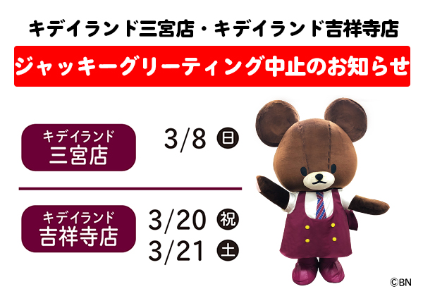 キデイランド三宮店にて3月8日および、キデイランド吉祥寺店にて3月20・21日開催予定のグリーティングは、慎重に準備を進めてまいりましたが、新型コロナウィルス感染症が拡大している状況を受け、ご来場のお客様をはじめ、関係各位の健康と安全を第一に協議した結果、やむを得ず中止させて頂きますことをご案内申し上げます。