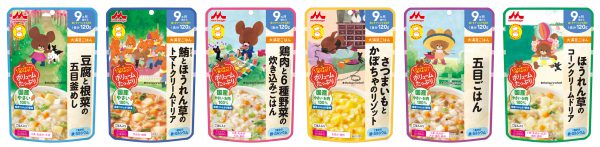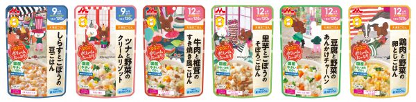野菜や肉など具材もたっぷり加えた、ごはん入りの大容量のベビーフード。9ヵ月頃からのメニュー(8品)と12ヵ月頃からのメニュー(8品)、全16品のラインアップです。