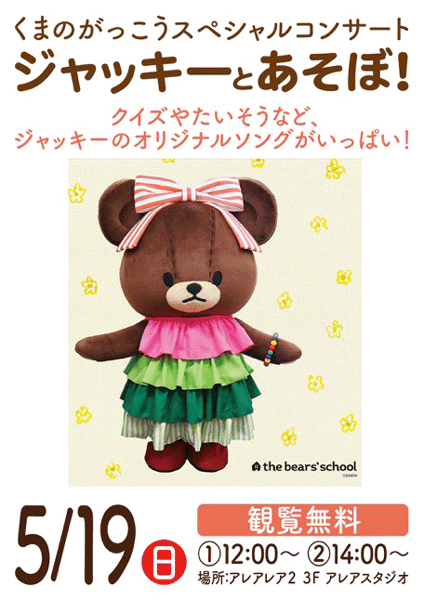 5月19日東京・立川アレアレア2 3階アレアスタジオラーメンスクエア特設ステージにて「くまのがっこうスペシャルコンサート ~ジャッキーとあそぼ!~」の開催が決定しました♪