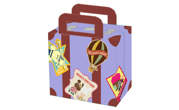 ジャッキーの持っているトランクケースをイメージした箱の中にはくまのがっこうグッズがたくさんはいっています♪