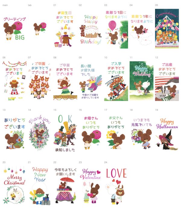 くまのこたちが季節のあいさつやお祝いをかわいく伝えてくれます。